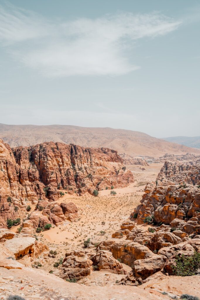 Le chemin grimpe vers Naqeb Slasel, une ancienne route caravanière. En arrivant au sommet, une vue spectaculaire se dévoile sur Wadi Musa et l’entrée de Petra au loin. Le désert laisse peu à peu place aux premières constructions modernes.